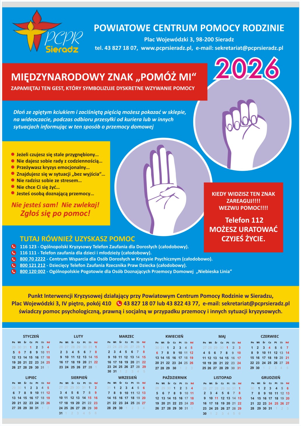 Powiatowe Centrum Pomocy Rodzinie w Sieradzu opracowało kalendarz plakatowy na 2026 rok, który jest dedykowany wszystkim mieszkańcom Powiatu Sieradzkiego. Zawarte na nim informacje mają pomóc osobom doznającym przemocy domowej.